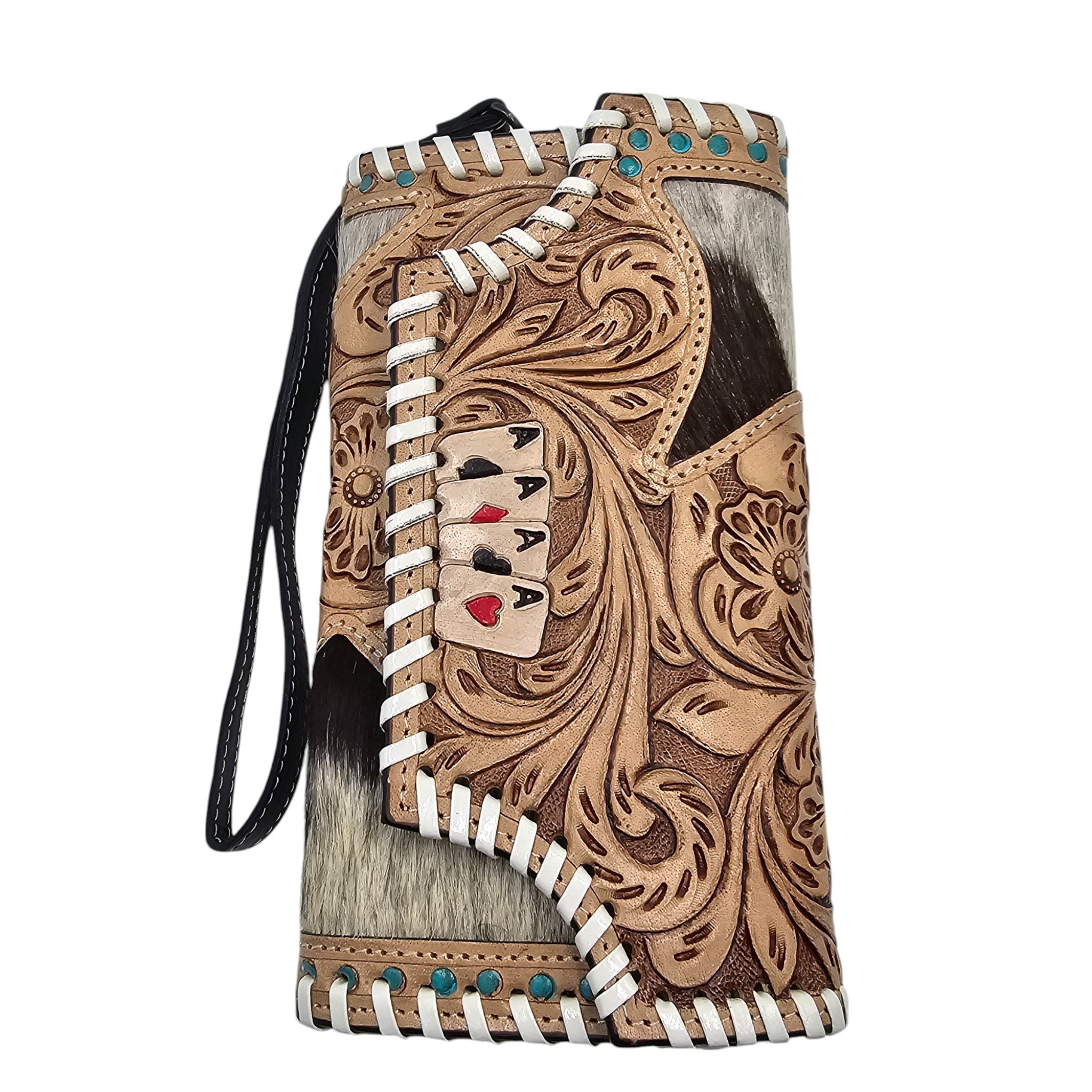 The Montana Twist Genuine Leather Cowhide Aces Wallet is made from high-quality leather and features a stunning white stitching design. With its durable and stylish design, this wallet is not only a practical choice for storing your essentials, but also a fashion statement that will elevate your style.