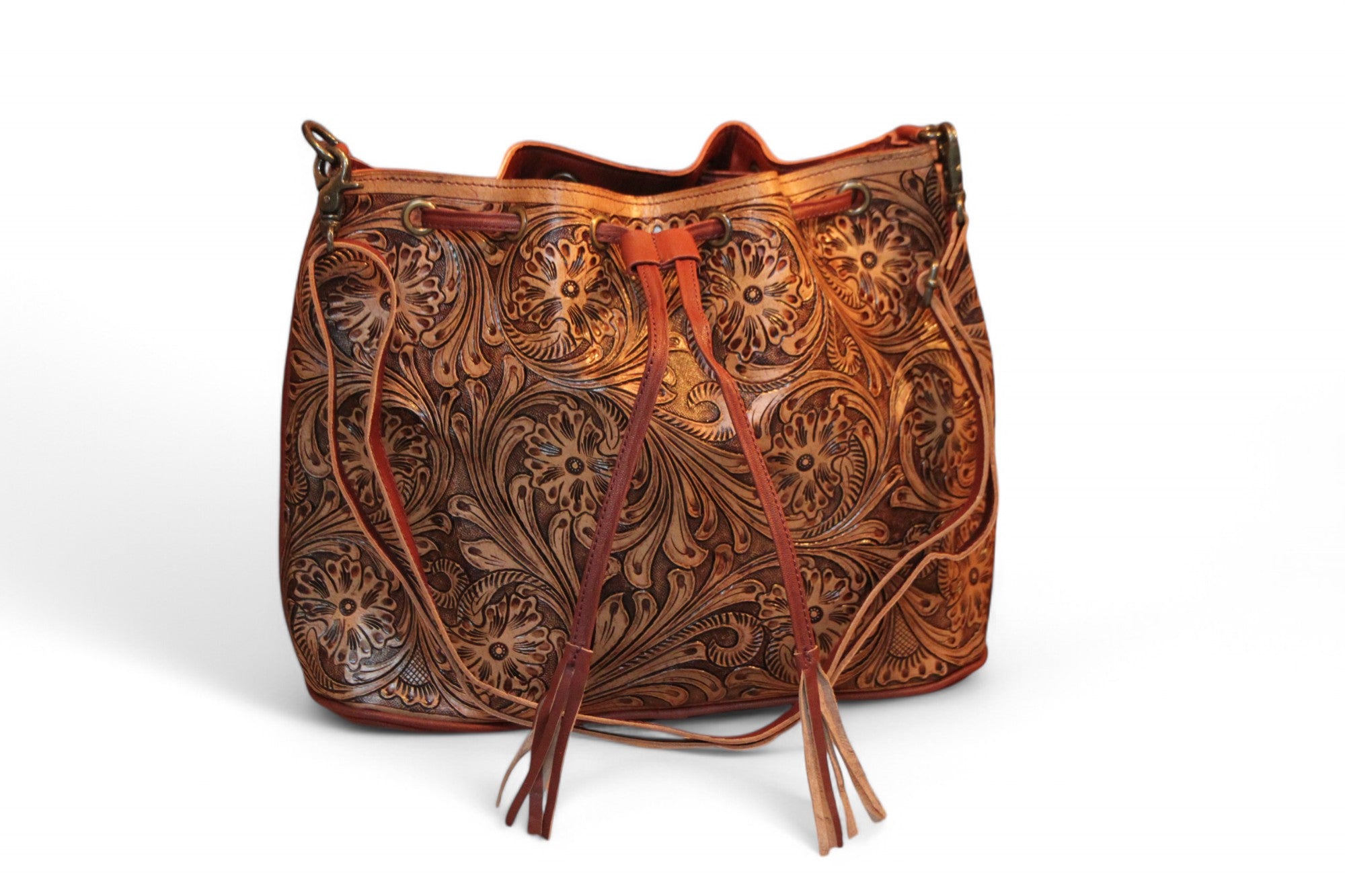 Experience the ultimate blend of style and functionality with our Montana Twist Genuine Leather Tooled Bucket Bag. Adorned with exquisite Western floral tooling and equipped with a comfortable shoulder strap, this bag is perfect for your everyday needs. Elevate your fashion game and make a statement with this must-have accessory!