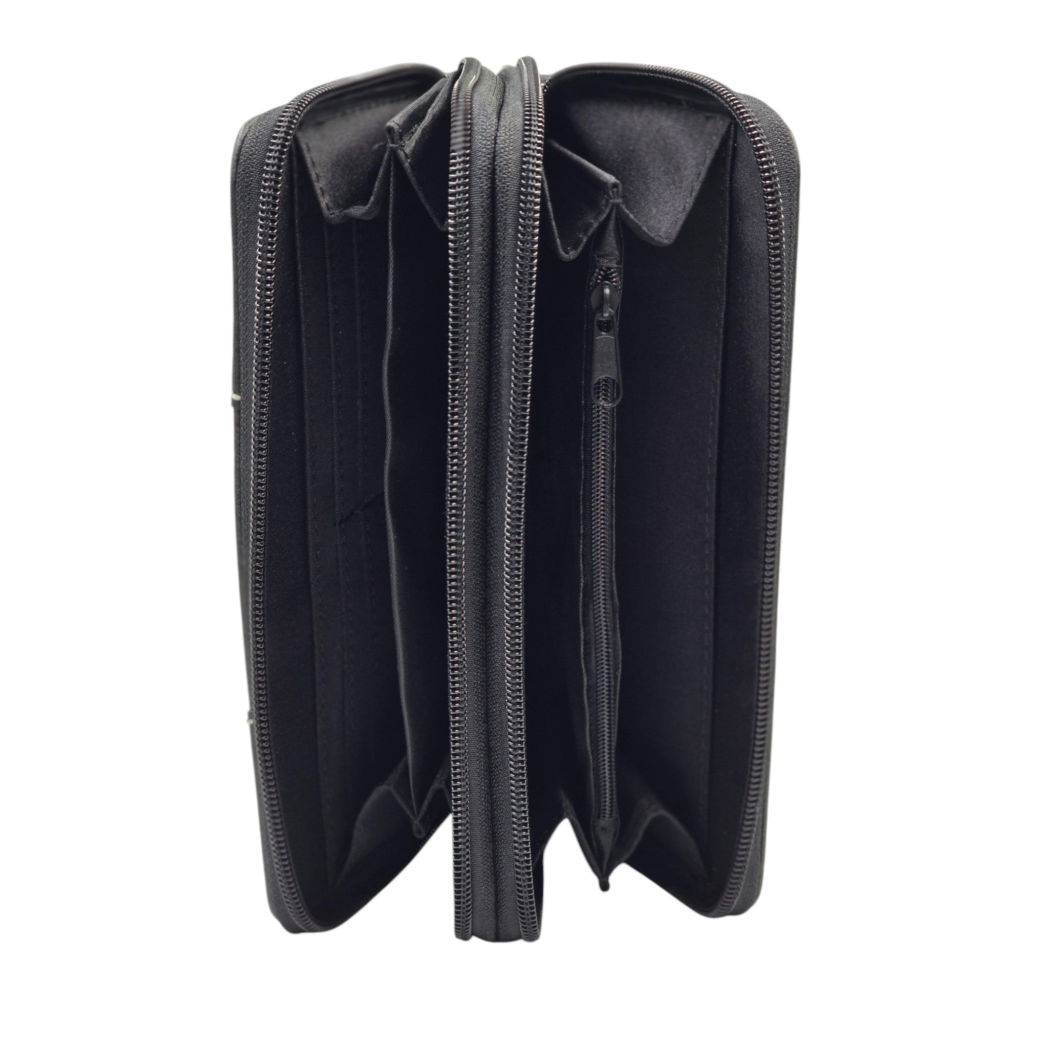 Inside complete with double zippered compartments. 8 card slots, 2 bill slots, 2 open slots, and 1 coin zipper pouch.