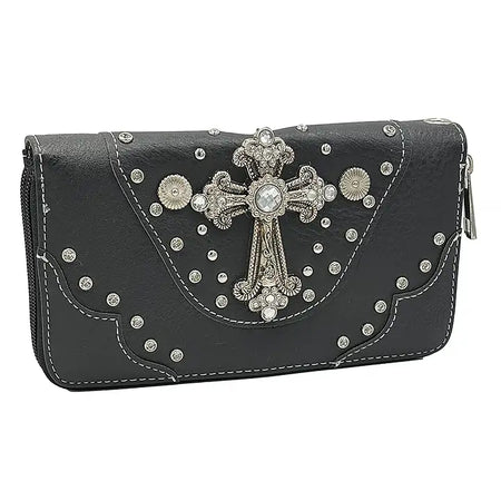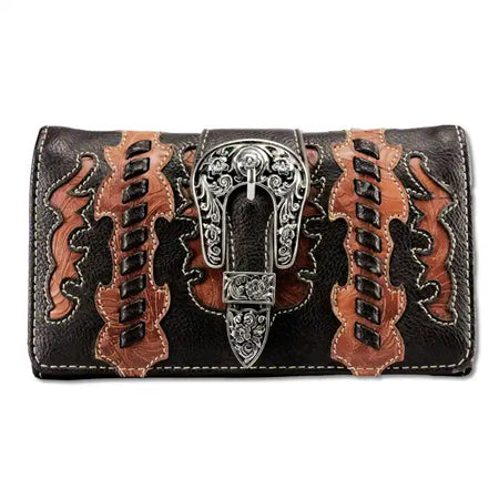 Montana Twist Crossbody Phone Bag - Red Tooled PU Leather Laser-Engraved Embroidery Flower and Concho Crossbody Phone Bag with front phone pocket, shoulder strap, zippered. Inside complete with 12 card slots and 3 bill slots.